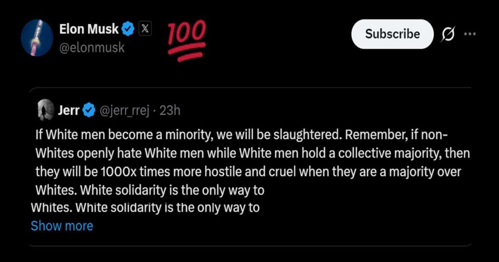 Власник X Ілон Маск уранці 8 січня 2026 року додав реакцію «💯» до посту іншого автора, який стверджував, що «солідарність білих — єдиний шлях до виживання». Також у дописі йшлося про те, що якщо білі чоловіки стануть меншістю, вони нібито будуть «знищені».