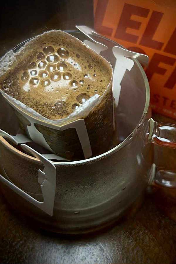 За словами Олександра, дрип-пакет — це порційний фільтр з уже змеленою свіжою кавою, який кріпиться на чашку. Достатньо лише зачепити його за «вушка» на край горнятка і повільно залити гарячою водою.