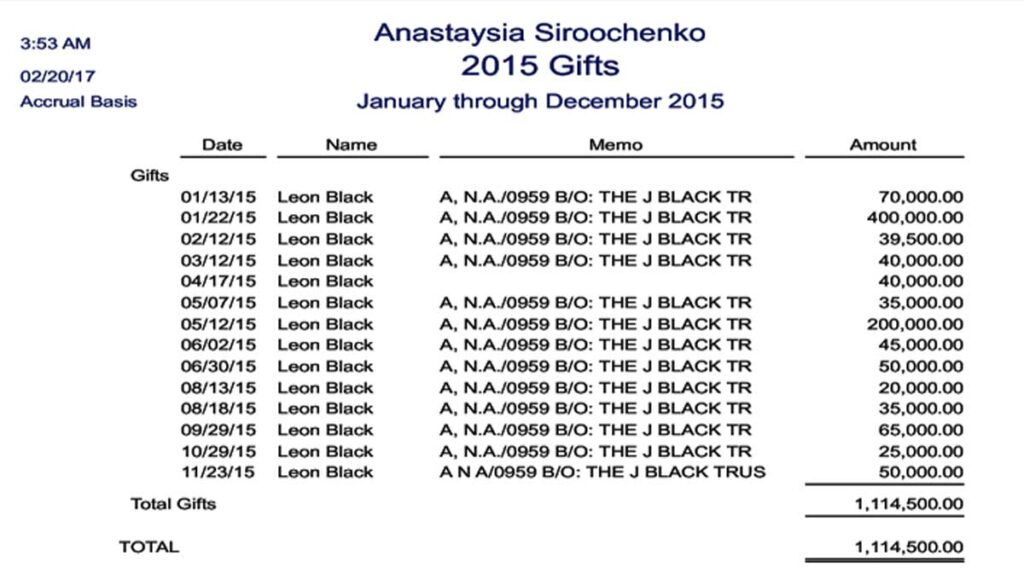 У цих матеріалах також містяться фінансові записи про грошові перекази на користь Сірооченко від американського мільярдера Leon Black, одного з ключових клієнтів Епштейна. За даними журналістів, у 2011–2016 роках загальна сума таких переказів перевищила $3 мільйони. Леон Блек визнавав фінансові зв’язки з Епштейном і є фігурантом цивільних обвинувачень у сексуальному насильстві, які він заперечував; судових вироків щодо цих тверджень немає.